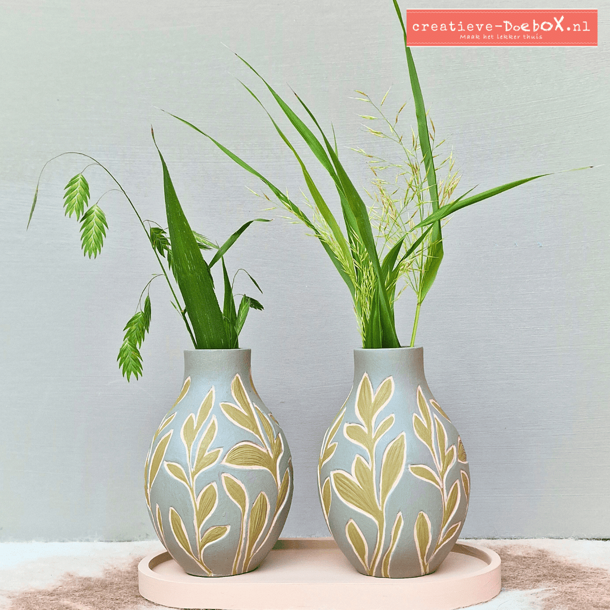 2 vaasjes met verzonken bladmotieven van keramisch gips (hoogte 11 cm)
