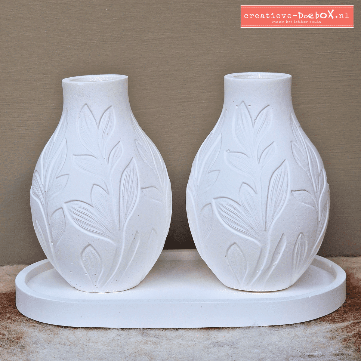 De set bestaat uit een ovale schotel (17,5 × 9 × 1,3 cm) en twee stijlvolle vaasjes van keramisch gips (hoogte 11 cm). De bladmotieven zijn subtiel verzonken in het oppervlak van de vaasjes – dat geeft een prachtig rustig effect en maakt ze extra bijzonder om te schilderen.