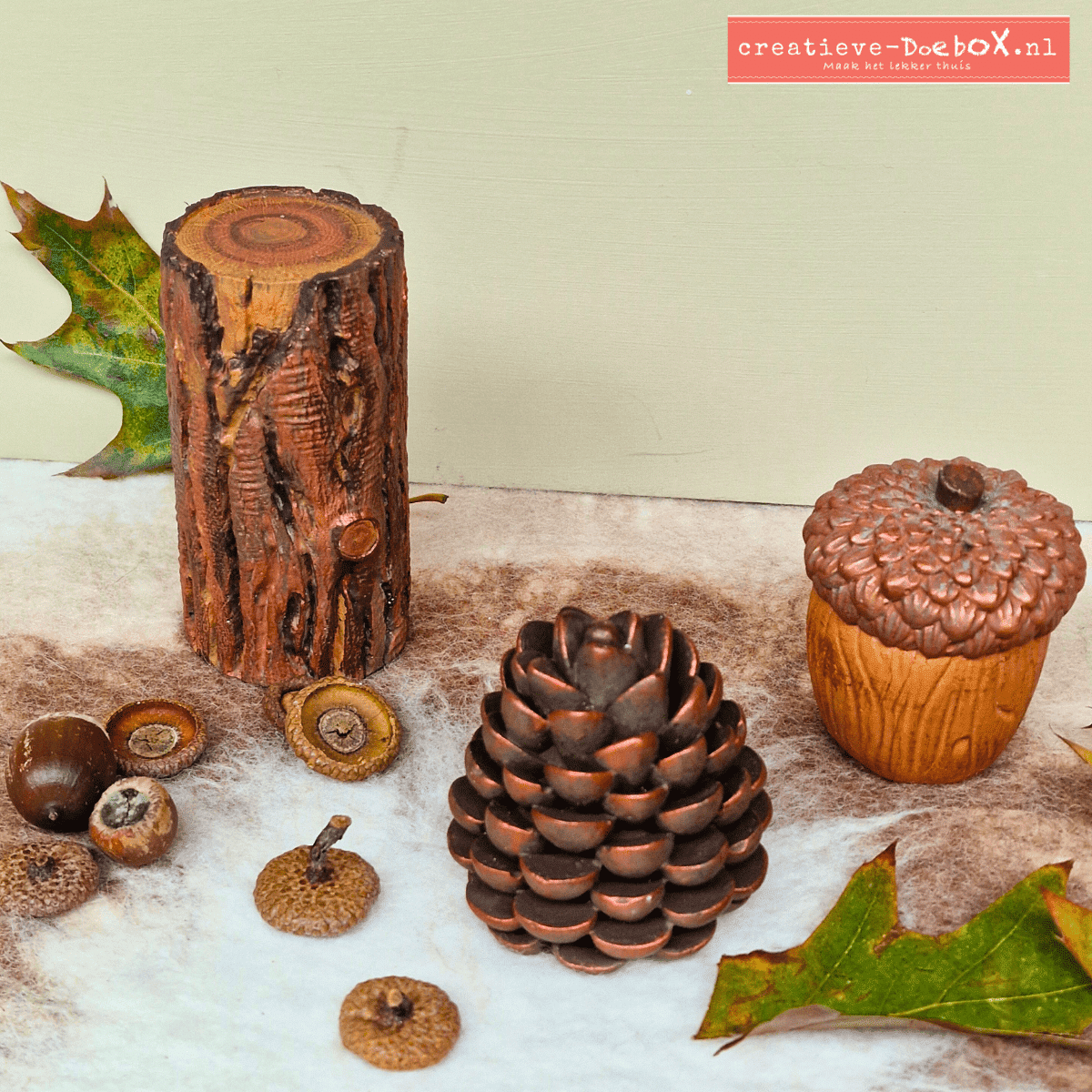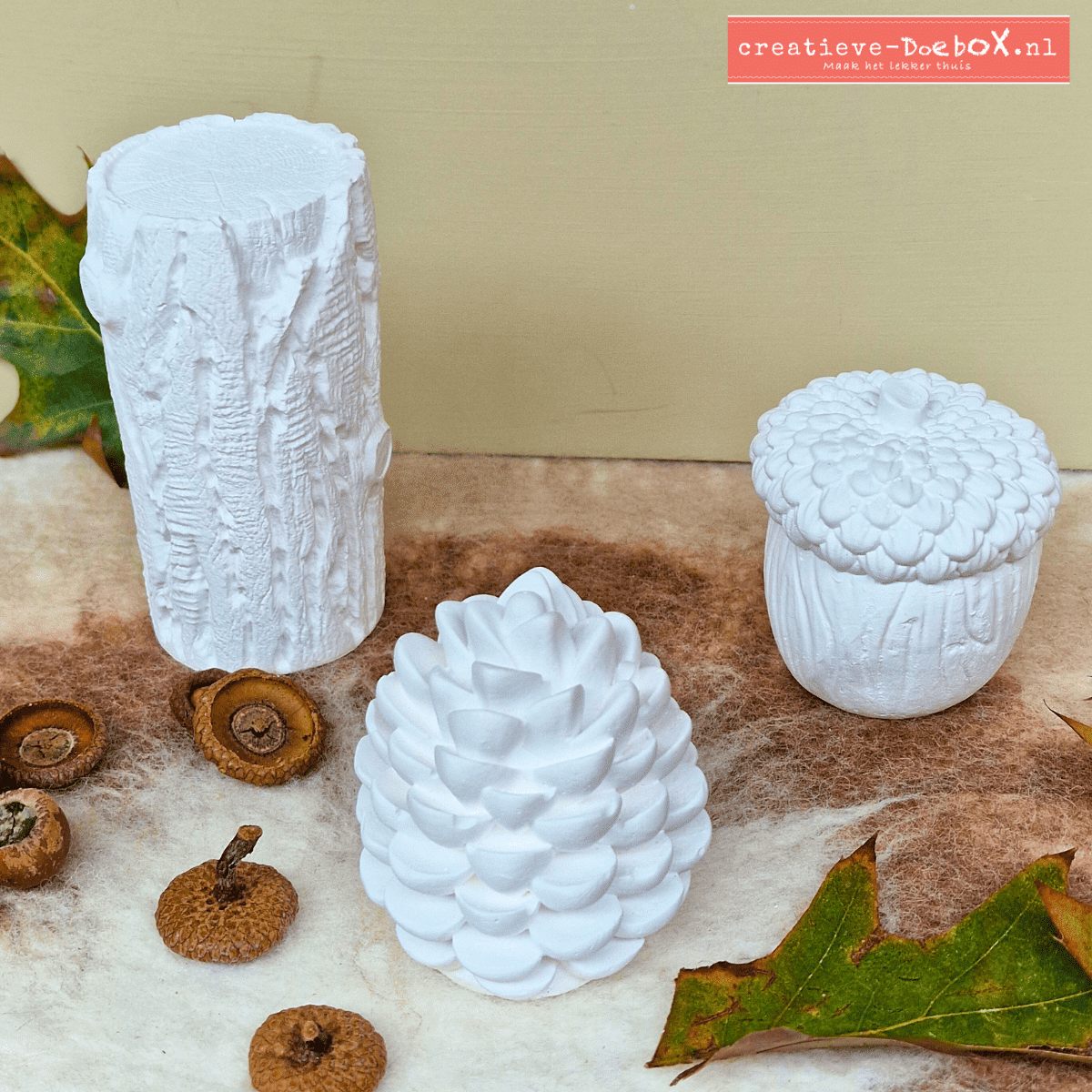 Boomstammetje, dennenappel en eikeltje van keramisch gips
