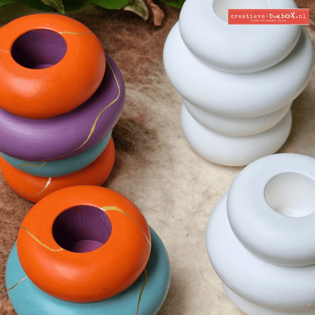Deze set van 2 kandelaars van keramisch gips heeft een speelse vorm die doet denken aan opgestapelde donuts.