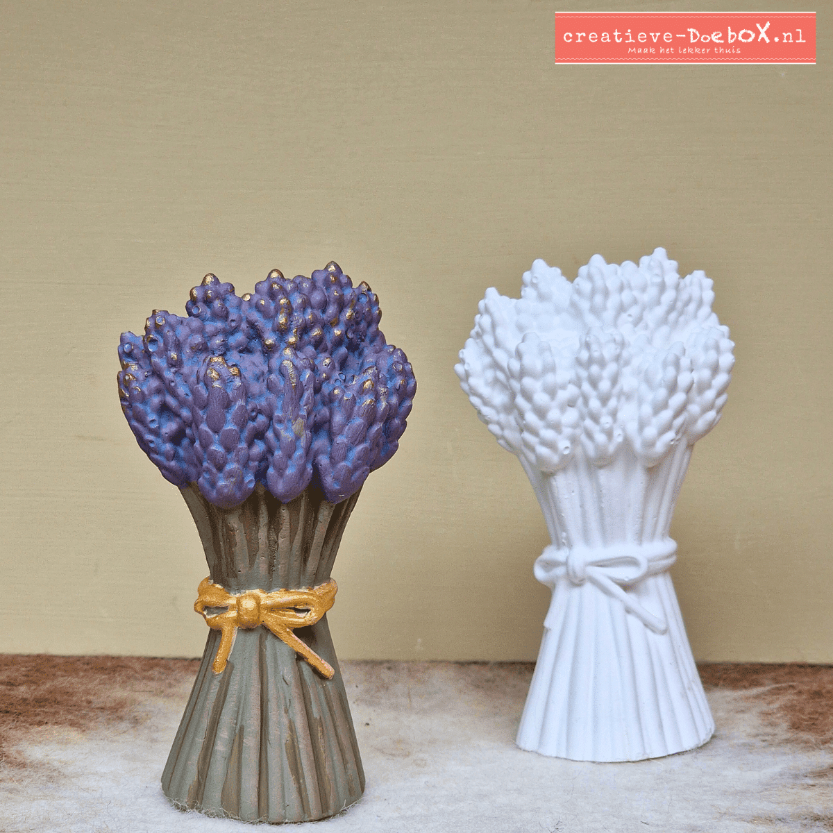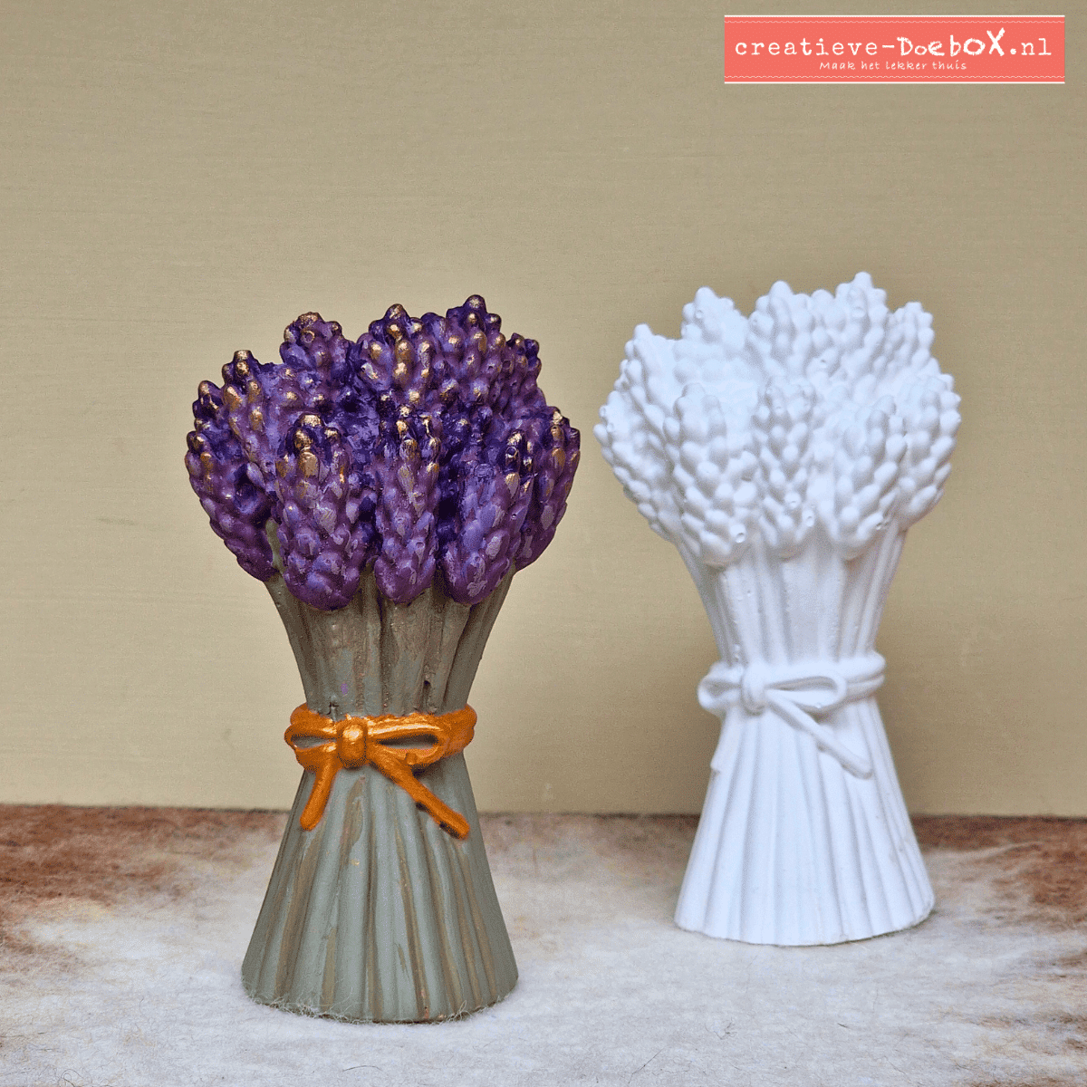 De twee lavendelboeketjes met strik hebben een hoogte van 11 cm en een doorsnede van 6,5 cm. Ze blijven stevig rechtop staan — dus perfect voor op een plankje, vensterbank of tafeldecoratie.