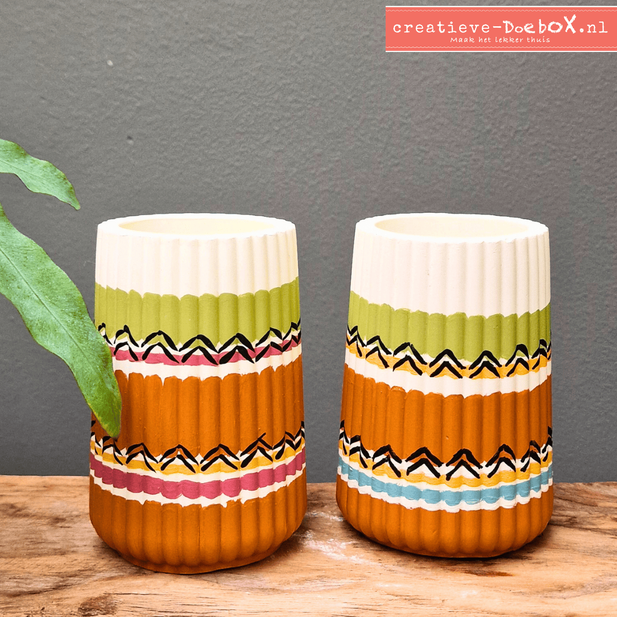 Deze set van twee toffe vaasjes (Ø 7 cm, hoogte 10 cm) is perfect voor iedereen die houdt van creatief bezig zijn met een sfeervol resultaat. Beschilder ze in jouw stijl – of laat ze juist lekker basic. Mijn voorbeeldje in vrolijke Mexicaanse stijl met droogbloemetjes geeft alvast wat inspiratie, maar ik ben heel benieuwd wat jij ervan maakt!