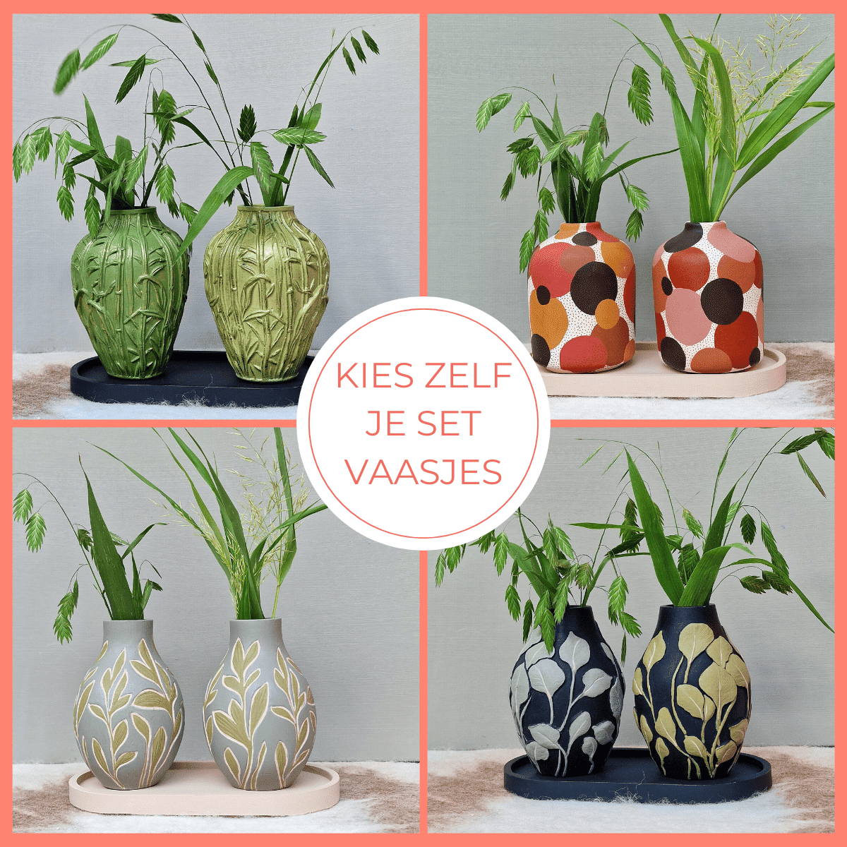 Ik heb voorbeeldjes gemaakt ter inspiratie, maar op deze pagina kies je zelf je verfserie. Zo wordt elke set uniek en helemaal passend bij jouw smaak, interieur of moment.