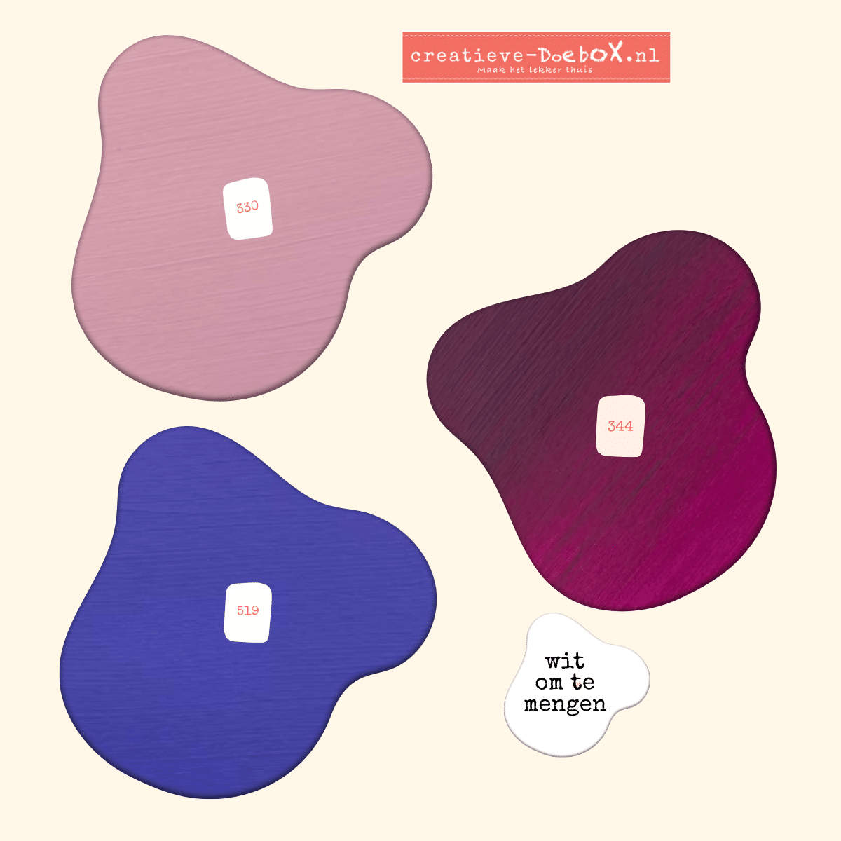 Er zit standaard een cupje wit of ivoor bij om je kleuren mee te mengen. Op zoek naar een extra kleurtje? Kijk eens bij de 25 losse kleuren in de shop.